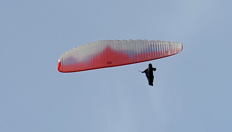 It was a paraglider, catching the thermals around the mountain. Then we realized there was another--and another--and another . . . We could spot eleven different parachutes in the air. In the picture below, we caught three in the same frame.